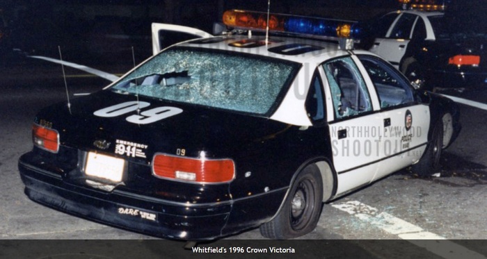 В этот момент патрульная машина офицеров Шрамма и Ланца остановились на перекрестке Арчвуд- стрит и Лорел Каньон, через дорогу от Хэйнеса и Уитфилда. Патрульные открыли огонь из пистолетов, прикрываясь дверями автомобиля.
