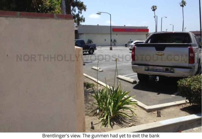 Филлипс и Матасариану, двигаясь по тротуару, вели огонь по полицейским, находившимся на стоянке (влево от них), на перекрестке (влево по диагонали) и вдоль бульвара (прямо перед ними). В этот момент тяжелые ранения получил гражданский, оказавшийся не в том месте и не в то время- в левую руку, левую ногу, в живот и в пах. К этому моменту налетчики выпустили примерно 416 патронов [16].