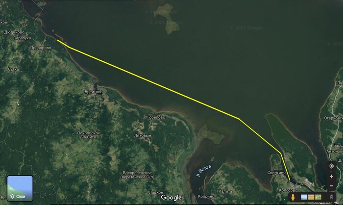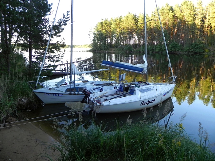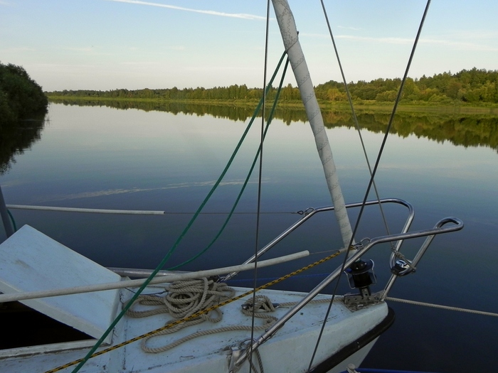 Проходим Брейтово. На горизонте видны чьи-то паруса, но далеко, даже в бинокль не разглядеть. Впоследствии выяснилось, что это был коллега из нашего яхт-клуба на своей переделанной «Неве» - шел в Весьегонск.