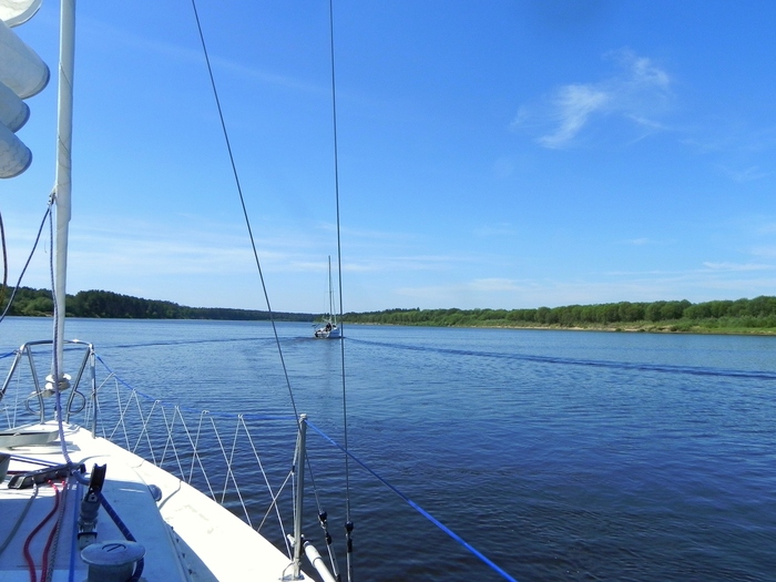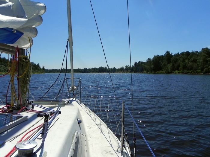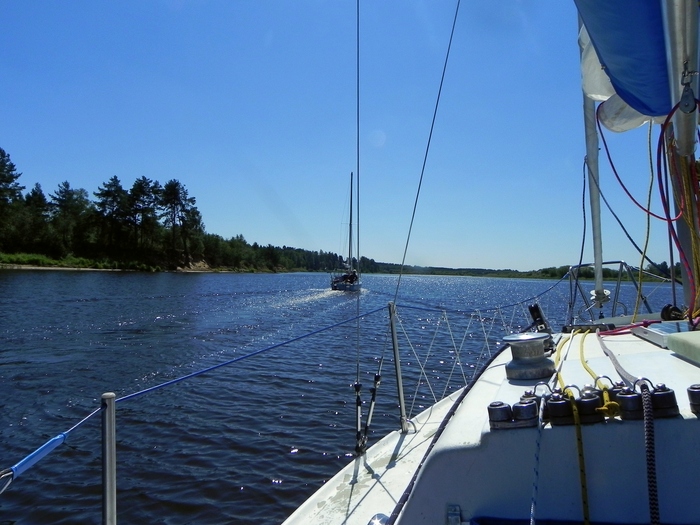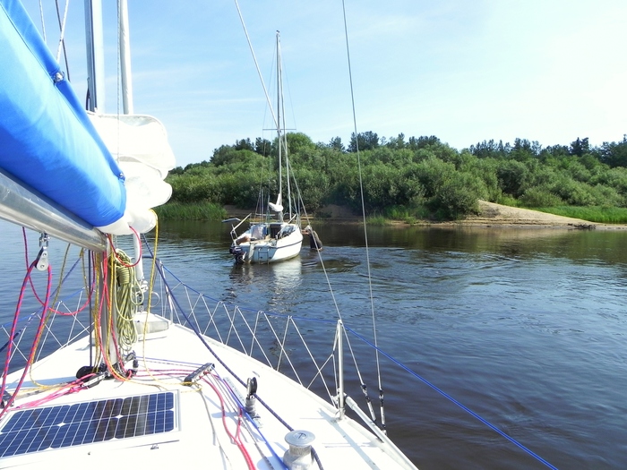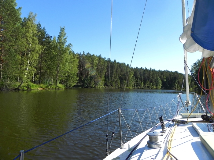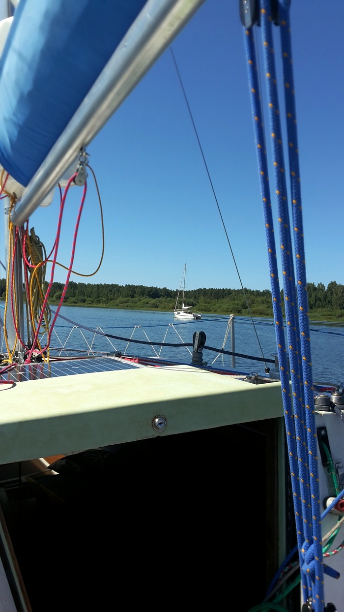 Вышли в 8:45. Фарватер проходили по вчерашним трекам на навигаторах. Пару километров удалось пройти под парусами в бейдевинд, но потом скисло и далее до дома «наслаждались» тарахтением моторов.