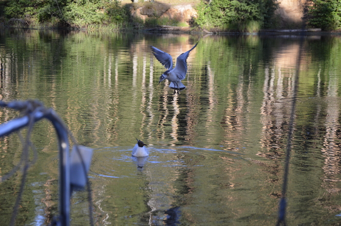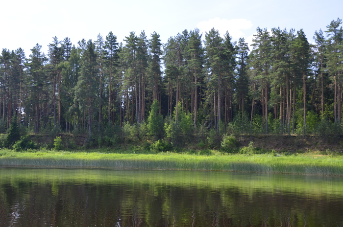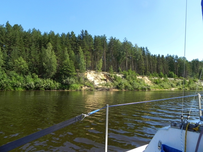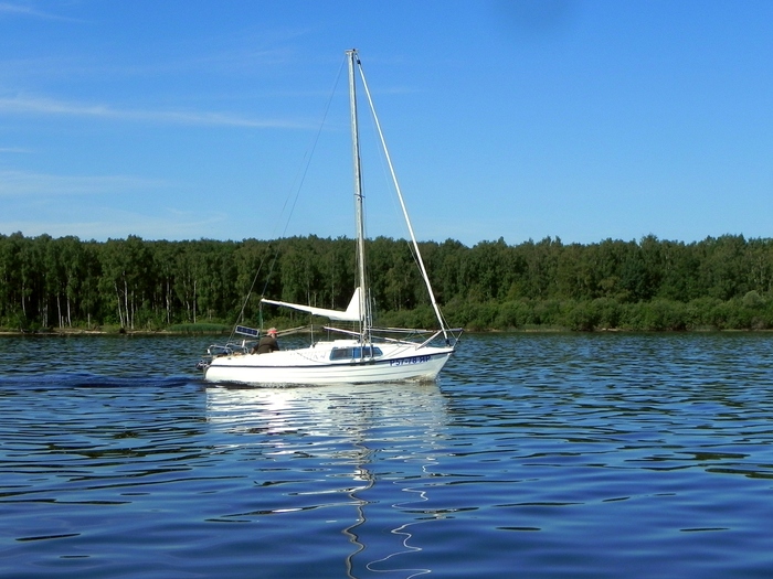 На выходе Алексей неожиданно сел на мель - взял близко к берегу. Пришлось ему приподымать киль. Пользуясь благоприятным ветерком, ставим паруса и наслаждаемся тишиной.