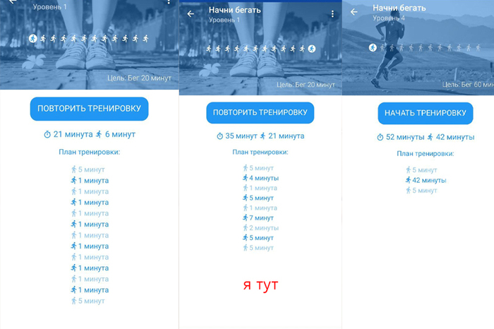 Я прошла только первый уровень, и это было нууу больше 2 месяцев вместо запланированных 4 недель)) иногда там такие резкие скачки были, что я офигевала - да ну не могу, выдыхаюсь, ноги устали, руки устали (руки, Карл! серьёзно, были моменты, что и дыхалка в норме, и ноги живые, а руки отваливаются), и бывало что я на одной тренировке сидела неделю, просто потому что не могла перейти с состояния "а чо всмысле 3 минуты подряд бежать???" до "пф, сегодня 4 минуты макс, завтра 2 раза по 4 и 5, аще легко", но становится всё проще и легче. И на сегодняшний момент это мой абсолютный рекорд. Месяца 3-4 назад знать, что я смогу пробежать 7 минут без перерыва - это было нереально! Когда и 2 минуты бега подряд для меня было подвигом!
