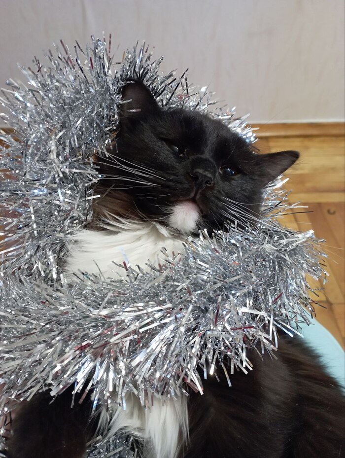 Хотела засунуть красивых новогодних котеков, чтобы срубить плюсцов, но все шерстяные жопы куда-то спрятались и получилось снасильничать мишурой только Боню