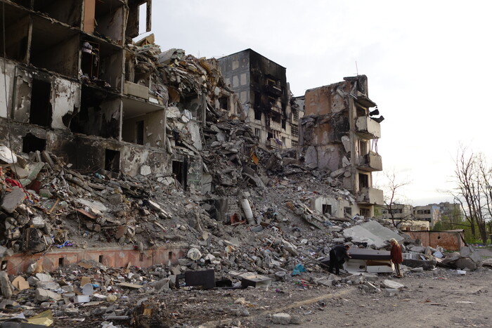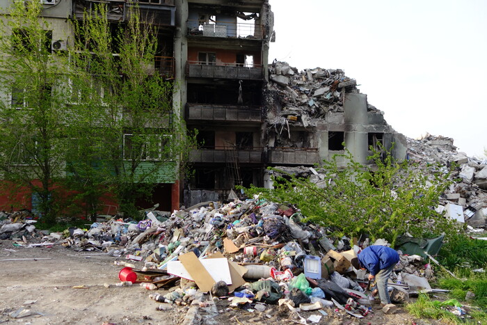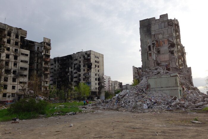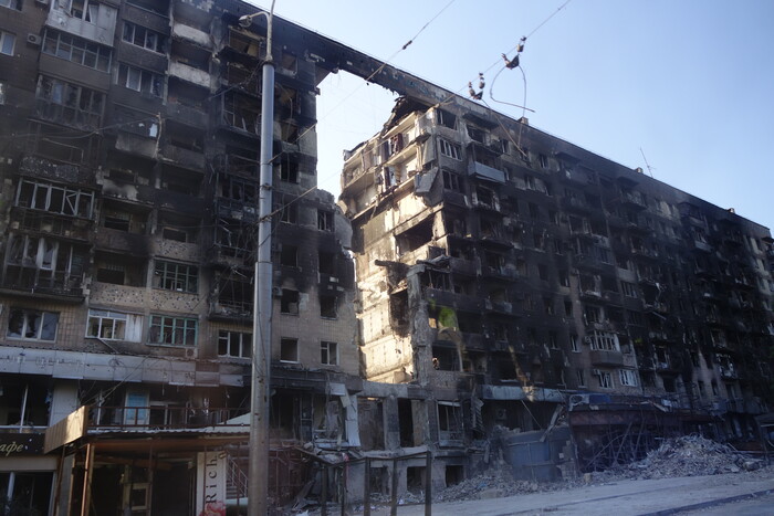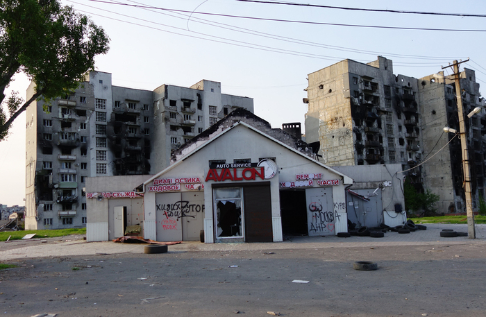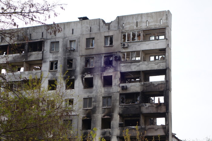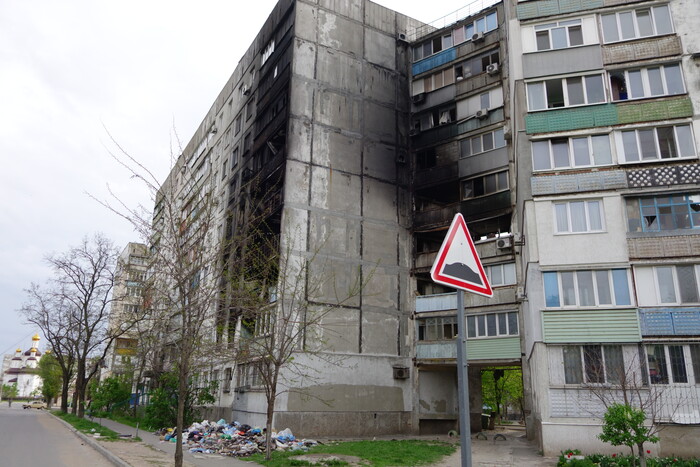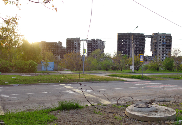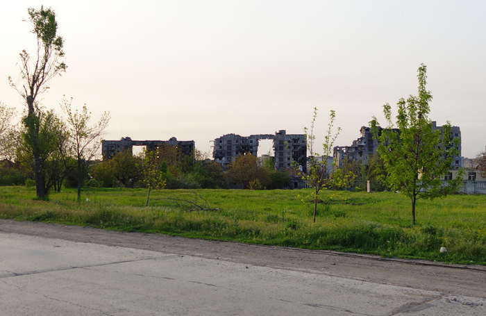 6:54. Три многоэтажки с обвалившимися подъездами. В прошлой части уже писал, как азовцы превращали эти дома в огневые точки.
