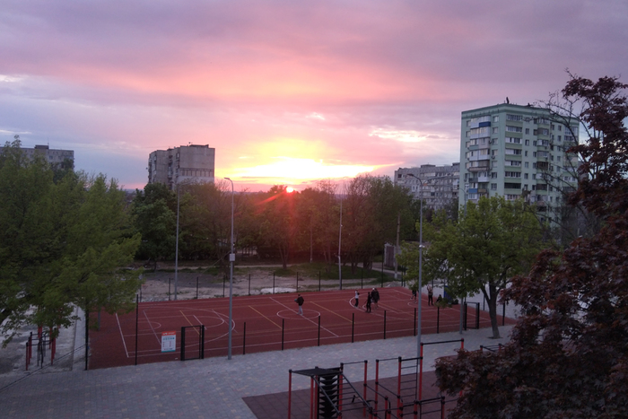 Закат 9 мая был очень красивый. Все перенервничали, вечером поиграли в баскет.
