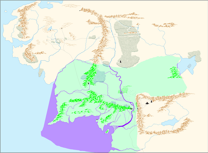 Пока местный Темный властелин усиленно воевал с богами где-то на краю мира, эльфы не теряли времени даром - активно заселяли разрушенные территории, восстанавливали мосты, дороги и прочую инфраструктуру, пущенную под откос старыми войнами, которые не прекращались до этого почти тысячу лет. Главными из них были эльфы Линдона (на карте прилагается примерное расположение) и руководил ими последний из эльфийских королей Гил-Галад. На удивление он не был долбоебом, как многие эльфийские вожди до него - хотя бы начиная с того, что он не убивал без причины своих родичей, эльфов или людей, из-за чего вообще возникали подозрения - а король ли он вообще?