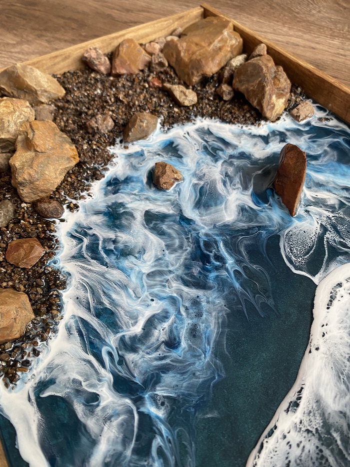Но на самом деле это эпоксидная смола, плиточная затирка, соль, акриловые краски. Основа - фанера. Размер 30х30 см.