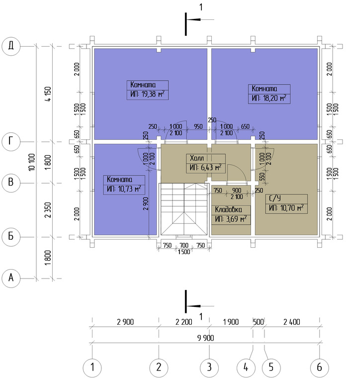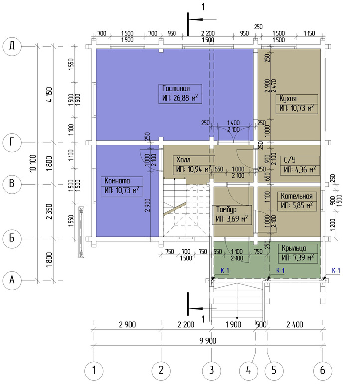 Дом имеет простую двускатную крышу, что позволяет применять скользящие крепления стропил и максимально удешевляет кровлю и упрощает её монтаж. Габаритные размеры 10,1 х 9,9 м даны по центрам стен. Для понимания, гостиную и кухню разделяет проём размером 2,9(ш)х2,47(в) м.