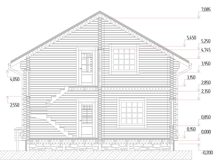 Высота первого этажа 2,7 м в чистоте, мансарды после отделки потолка получится 1,8 м в самой низкой точке и 4,1 возле конька. Вообще, можно сделать дом и ниже, убрав пару венцов, но я привожу вариант, который делал бы, если бы строил себе.