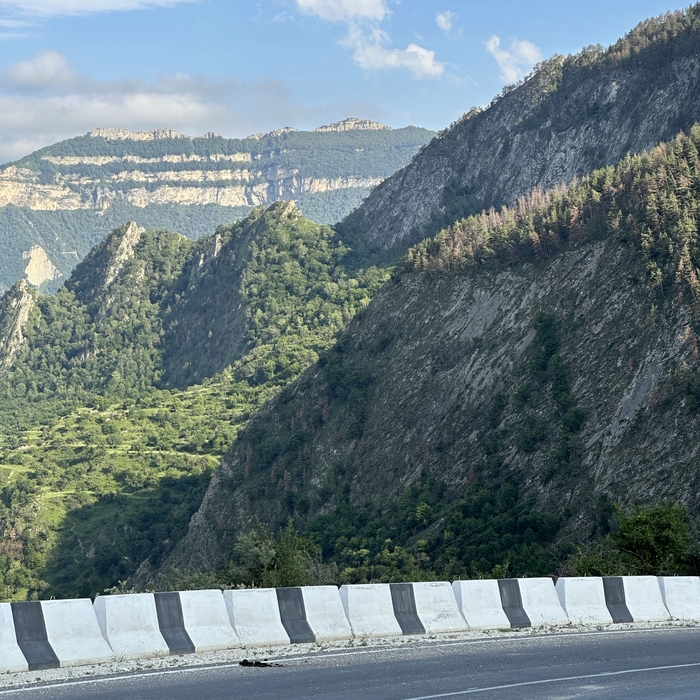 Время пролетало незаметно, Саша мастерски вел свой Ниссан по петлявшей вдоль склонов дороге, мы наслаждались комфортной поездкой и видами из окна. Проехав почти 150 км, заехали в кафешку, где Шамиль купил несколько чудушек и сока. Со всем этим добром мы остановились в красивом месте недалеко от села Куппа и устроили пикник. Подкрепившись и немного отдохнув, мы проехали еще 20 км до поворота на Салту. Там мы попрощались и пошли по дороге к водопаду.