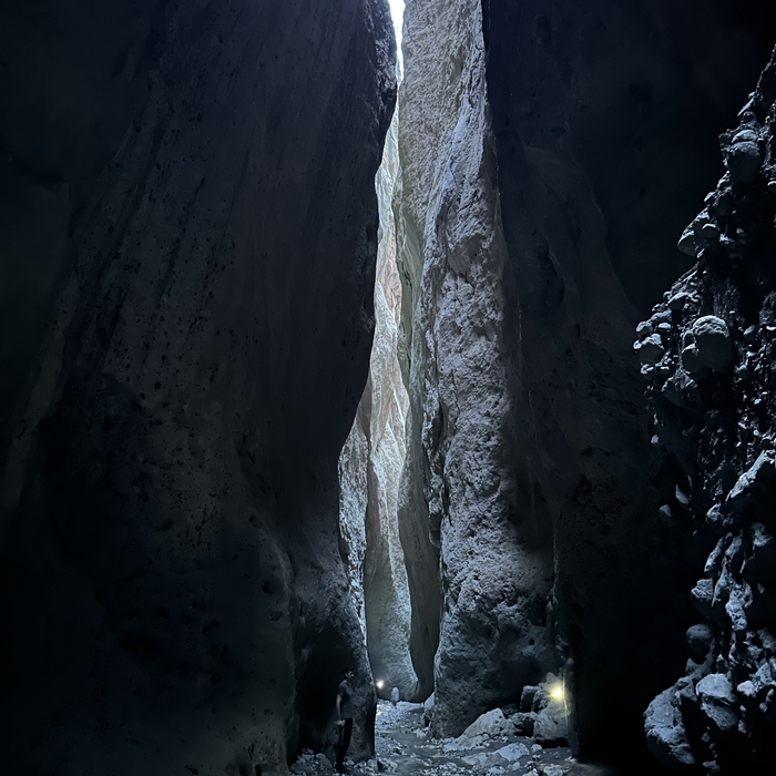 Приехав к водопаду меня настигло разочарование. Если в крепости Нарын-кала для меня было ожидаемо встретить толпу туристов, всё-таки это значимая достопримечательность, да и находится в легкодоступном месте, в городе, то здесь это меня удивило. Людей настолько много, что образовалась очередь на вход, который стоил 100 р. Не знаю, что Изиль сказал парням на входе, но нас пропустили бесплатно. За входом начинался ручей, ведущий к водопаду, тут же располагались места, где можно было арендовать резиновые сапоги, чтобы не намочить ноги (которые все равно мокли даже в сапогах), но мы решили идти босиком. По ручью с каменистым дном нужно было пройти около 300 метров, и в какой-то момент я понял, что сапоги должны защищать не столько от воды, как от камней на дне, и нам лучше было пойти в сланцах. Они былине острые, но наступать на небольшие было неприятно. Приноровившись наступать на большие плоские камни, мы всё-таки добрались до водопада, поглазели, пофоткались и пошли назад. Ну а водопад очень необычно выглядит, он находится в конце Салтинской теснины (две горы стоящие очень близко друг к другу), которая в конце смыкается и получается что-то типа пещеры, а сам водопад, по сути, это дыра в потолке этой пещеры, через которую течет вода. Причем толщина этого потолка очень внушительная и когда понимаешь, что именно вода проделала эту дыру, это впечатляет.