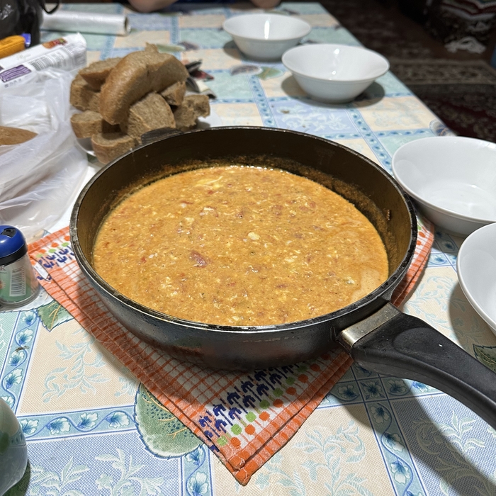 Заехав по пути в магазин, братья купили продуктов для ужина. Они предложили приготовить шакшуку, а мы в свою очередь предложили на завтрак угостить их овсянкой с сухофруктами из нашей провизии. Шакшука – это блюдо ближневосточной кухни, представляет собой яичницу с помидорами, томатной пастой, болгарским перцем, луком и специями.