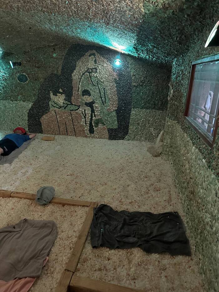 6) Основные отличия между китайскими саунами и корейскими, в плане самих саун, это разнообразие комнат. В Китае помимо финской сауны и хамама, вы может найдете только соленую пещеру и ее аналоги. У корейцев с этим больше разнообразия: соляная комната, глиняная комната, чиловая комната из пункта 3, комната дзена, где вы отдыхаете и смотрите на видео природы, комната холодная, адская комната с камнями и температурой 80-90 градусов, аметистовая комната на фото. В них разные температуры и наверное разные цели. Мне впервые было просто интересно посмотреть какие вообще комнаты есть и меня удивило, как из много. А еще было пара закрытых комнат на ремонте. Но, в некоторых было некомфортно находиться босиком и опять же не хватало тапочек!