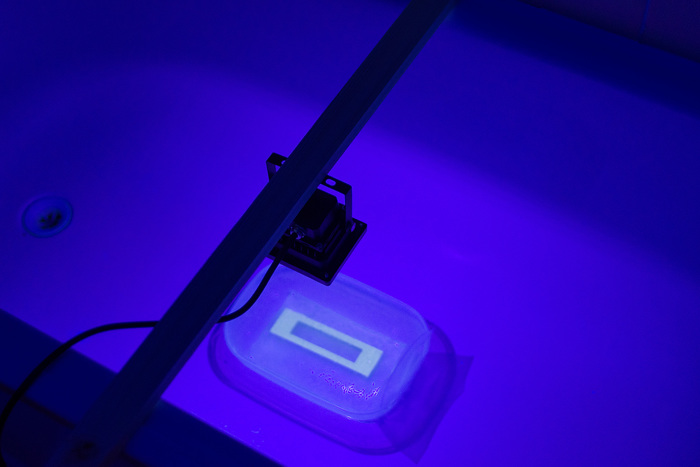 Я оставил обе детальки в своём антисолярии на ночь. Но когда наутро я извлёк их из пакета, то почти никакого эффекта не обнаружил. Это было фиаско. Если даже люминесцентная лампа, дающая, по идее, более глубокий ультрафиолет, не сработала, то стоит ли чего-то ждать от светодиодного прожектора? Но не зря же я его покупал — нужно попробовать.