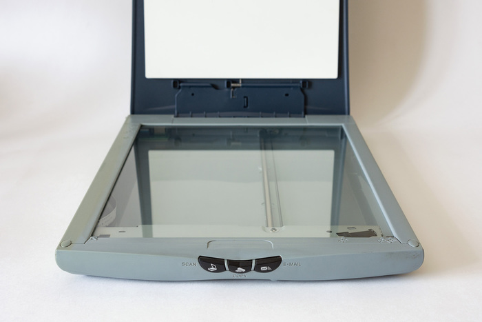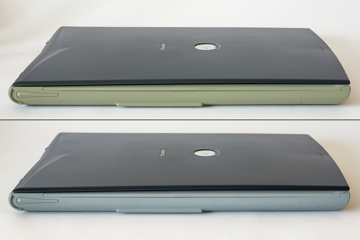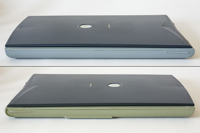 Убедившись, что гель работает, я взялся за более сложный случай — старый сканер, который почти 20 лет стоял одним боком к окну. Легко заметить чёткую границу, проходящую вдоль левого края.
