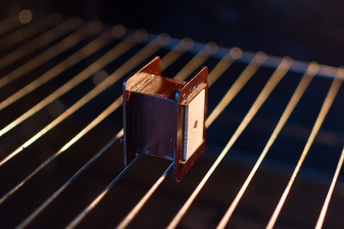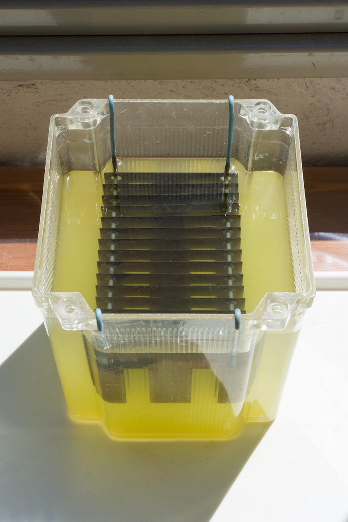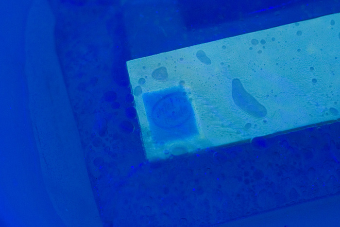 После четырёх часов экспонирования оказалось, что если результат и есть, то едва-едва заметный. Для ускорения процесса я решил подогреть перекись примерно до 40°C, для чего поместил корытце с пакетом внутрь большого контейнера с тёплой водой (кто читал прошлую статью, помнит о том, к чему может привести подогрев без водяной бани). Заодно я добавил в пакет ту самую заглушку, на которой проступили загадочные письмена.