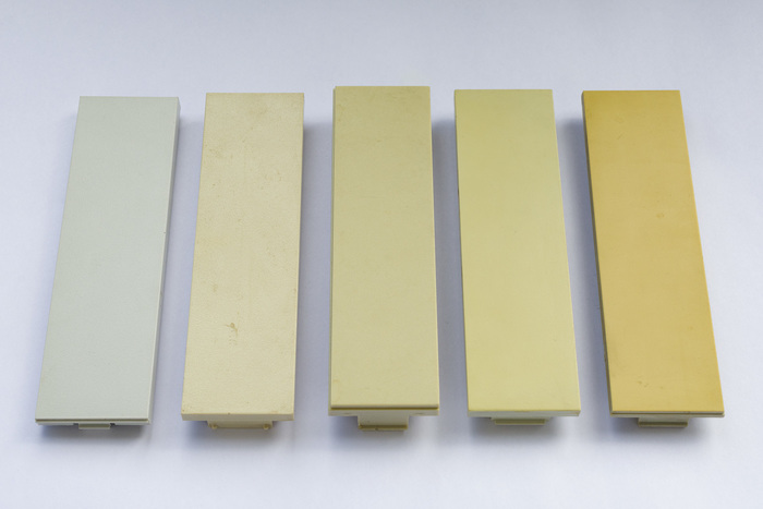 Первый эксперимент было решено провести с очень старой и очень жёлтой рамкой от корпуса 80-х годов. К сожалению, у меня потерялось фото в состоянии «до», но она была ещё желтее, чем крайняя правая заглушка отсюда:
