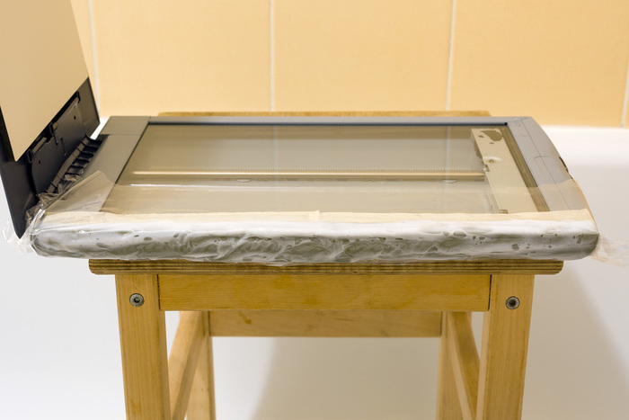 Я надел хозяйственные перчатки и щедро обмазал край сканера гелем. Малярный скотч выполняет двойную функцию — уменьшает воздействие на менее пожелтевшие участки и не даёт гелю затечь в щель между пластмассой и стеклом.