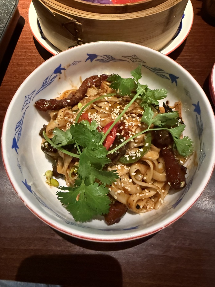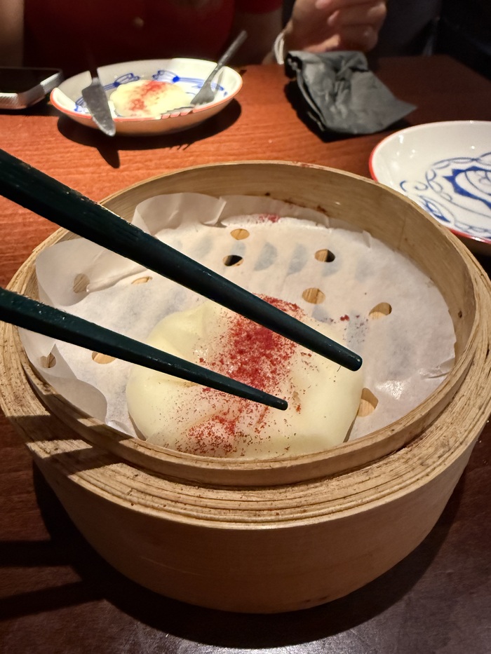 Что можно сказать про блюда, если коротко? Экономия на грани. Порции вроде нормальные, но мяса совсем немного. Салатик вкусный, но маленький. Пельмешки тоже вроде вкусные, но разваливаются, когда берёшь их с тарелки — по вкусу скучно, но вроде нормально. Но главный провал ожидал в конце: это Моти. Я, конечно, всё понимаю — бывают разные интерпретации блюд, но это просто позор! Даже в Татарстане замаскированный Моти под местный эчпочмак был очень необычным и вкусным. Здесь же это жалкая пародия непонятной формы из непонятных ингредиентов — провал. (Фото с палочками)