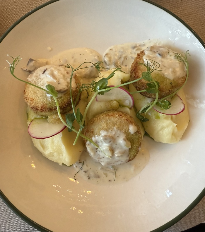 И, как ни странно, тут все прекрасно: и летняя веранда, и интерьер зала, и обслуживание. Водичку наливают, даже комплимент в виде черешни в конце — мелочь, а очень приятно, как и нежные трюфели к кофе. Атмосфера подталкивает к дегустации вкусных блюд из небольшого меню. Я, честно говоря, больше за такой концепт, и тренд у топовых мест именно в этом направлении: одной странички еды достаточно, но проработана эта страничка великолепно.
