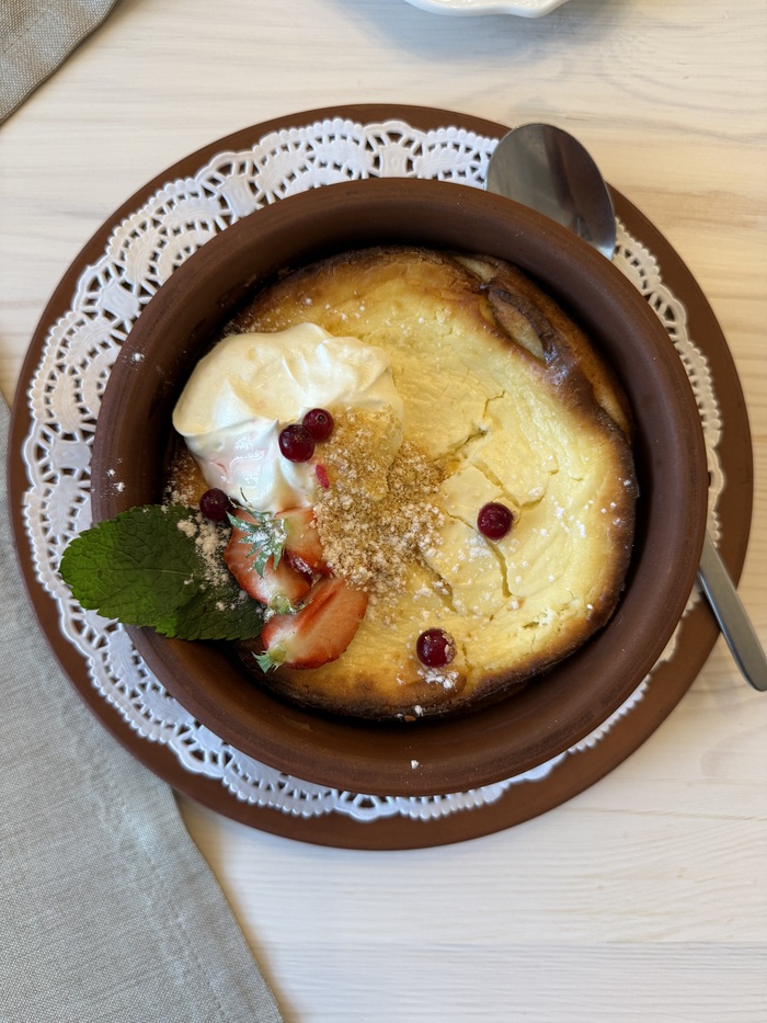 Цены нормальные для туристического заведения в туристической локации, может быть, чуть-чуть выше среднего. Меню среднего размера, естественно, с упором на русские блюда: хлеб пекут сами, десерты делают сами, всё готовят сами — за это однозначный респект. К подаче вопросов нет: всё выглядит красиво, так же как на картинках. Размеры порций нормальные — небольшие, но и не мизерные.