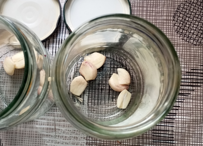 На дно баночек выкладываем резанный чеснок.