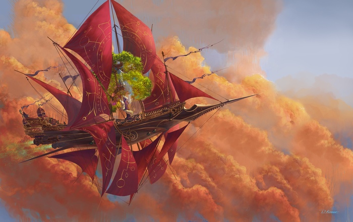 Честно отнятый в боях с соседним графством Вержелон и потом честно купленный героями солант «Дар любви» (идиотское слюнтявое название вместо бывшего армейского «Синяя тень») был неслабо повреждён во вчерашнем воздушном сражении, но лететь мог. Миротворцам нужно было выследить и нагнать небольшой мобильный отряд исследователей под предводительством мсье Тревиля де Воланжа, исследователя с какой-то шайтан-машиной, которая была весьма интересна рейдерам Мирраира.