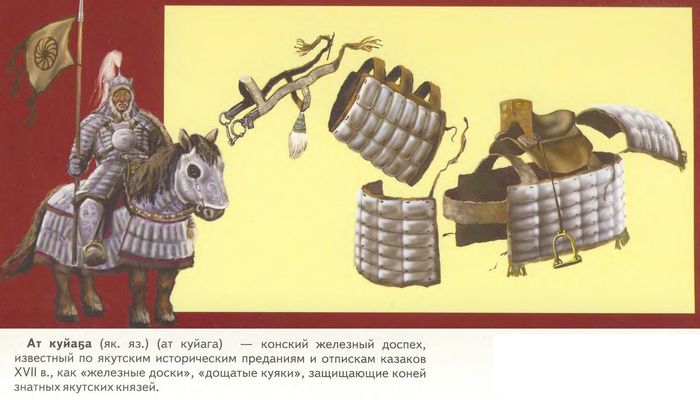 Якутский чешуйчатый доспех назывался - Хатырык куйах. Такие пластинчатые доспехи ламеллярного типа были широко распространены в среде якутских тойонов. Щитки на голенях, пришиваемые на обувь назывались кюнэсэ. Также называлась наспинная защитная пластинка. Сарын куйага - наплечники, предназначенные для защиты верхней части тела. На кисть одевались защитные нарукавники - Хары куйага. Похожие щитки использовались и для защиты голени. Железные щитки крепились с помощью ремешков, продеваемых через отверстия в пластине. Доспех украшали специальным магическим орнаментом. Лошади также одевали в доспех - Ат куйага.