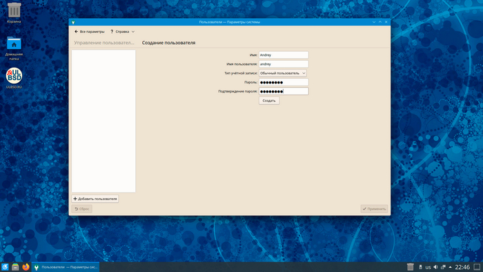 Сама установка проходит достаточно скучно, слайдов не завезли, поэтому остается только смотреть на медленно заполняющуюся шкалу с процентами. За это время можно сходить заварить себе чашечку чая и не забыть вернуться на завершающую стадию, где нужно будет настроить сеть и создать пользователей.