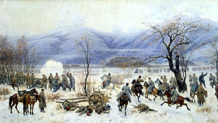Гурко не единственный преодолевал Балканы. Пока шли бои под Софией, пришли в движение отряды западнее. Карцов аккуратно и эффективно провел свою часть операции. Специфической чертой действий его отряда было активное взаимодействие с местными партизанами. Болгары и македонцы предоставили массу тягловых и вьючных животных, проводников, рабочих и вспомогательных отрядов. Подъем на Траянский перевал шел медленно, со скоростью не более 1–2 км/ч, на ужасающем морозе. Каждое орудие пришлось тянуть при помощи 47 буйволов, саперы работали без передыха. Карцов оказался серьезно ограничен по времени: восточнее, у Шипки, через Балканы прорывался сильный отряд Радецкого, и у Траянского перевала русские должны были как можно скорее перевалить хребет, чтобы отвлечь турок от места более важного удара.