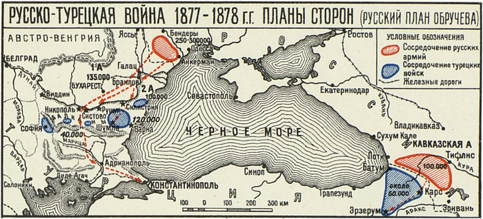 План русского генштаба был решительным и даже дерзким. В каком-то смысле он напоминал позднейший шлиффеновский замысел войны против Франции. Русские не собирались лезть в «четырехугольник крепостей», теряя время и силы. К тому же подавляющее превосходство (даже монополия) турецкого флота на Черном море превращало любые операции у побережий в рискованную затею. Замысел состоял в том, чтобы обойти турецкие укрепления по дуге с запада, прикрыться от возможных ударов, перехватить балканские перевалы, преодолеть хребет и быстрым движением выйти к Константинополю. В целом план удался — правда, утратил одно из главных своих достоинств: быстроту операции.