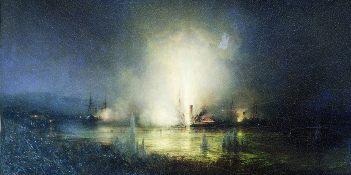Алексей Боголюбов. Взрыв броненосца Люфти-Джелиль. Отлетающая дымовая труба — реальная деталь. Позднее ее нашли в доброй сотне метров от места гибели корабля