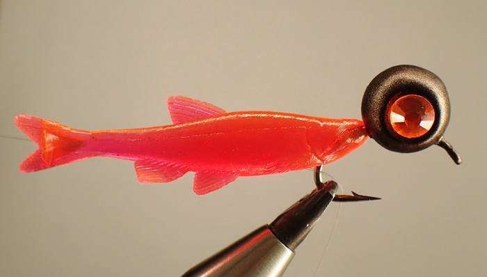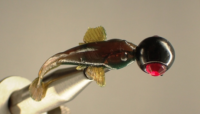 Крючок: Kumho 71470 N. Головка: олово. Монтажная нить: UNI, Dor-Tak. Тело: пленка иридисцентная, пленка ПВХ. Зачатки крыльев: ость пера петуха.