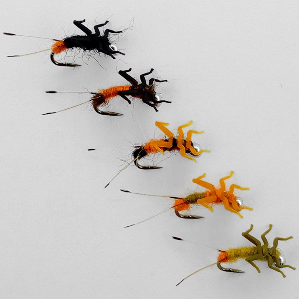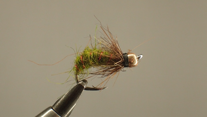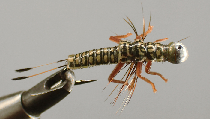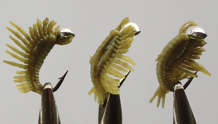 Крючок: Maruto 7023BR. Головка: бисер Toho. Монтажная нить: UNI thread. Утяжеление: свинцовая проволока. Усики и церки: ость пера золотого фазана. Тело и ножки: даббинг из медвежей шерсти, нить шерстяная, пленка ПВХ. Трахейные жабры: овечья шерсть, люрекс.