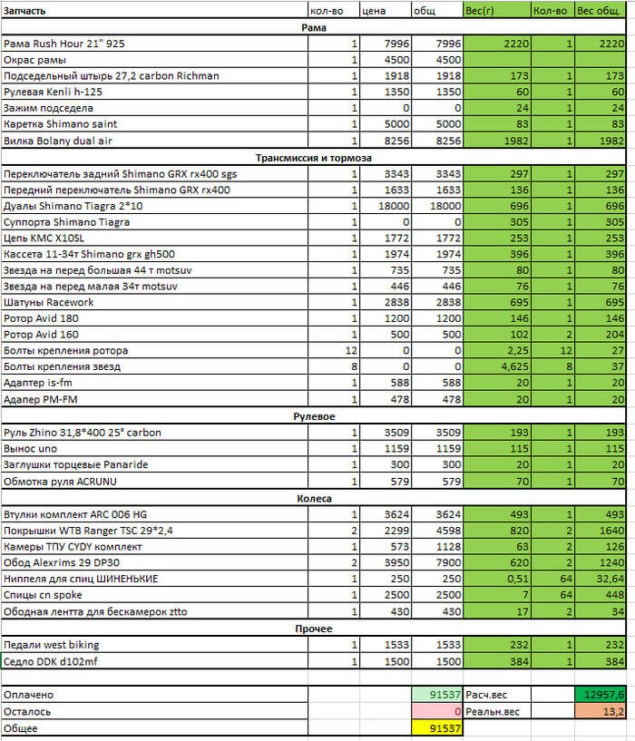По весу вышло 12,1 кг. (если бы собирал на ТПУ камерах и втулках arc, то можно было бы выйти на 11,7-11,8 кг.