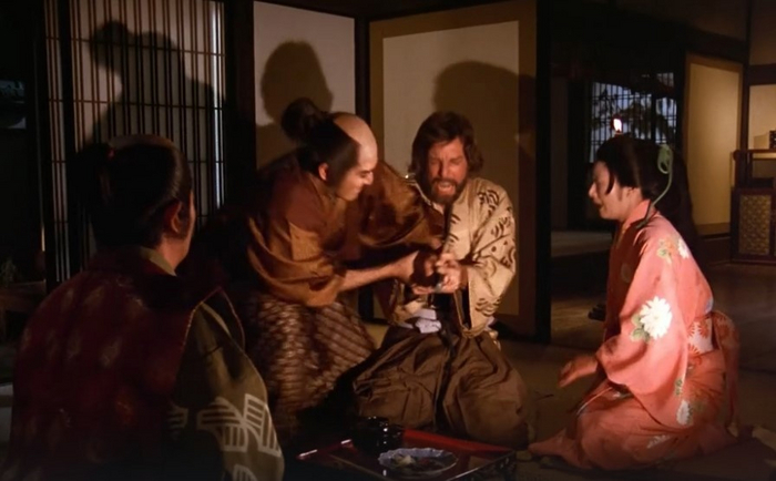 Вообще все японцы выглядят крайне достоверно. Роль князя Ябу играет знаменитый японский актер и комик, Фрэнки Сакаи. Его образ отличается от книжного, но винить исполнителя здесь нельзя, ибо Сакаи очень мощный харизматик. Его мимика способна отображать целую гамму чувств. Посмотрите на его заразительный смех, а потом на серьезное лицо в моменте, когда Блэкторн чуть не выпилил сам себя. Фото ниже: