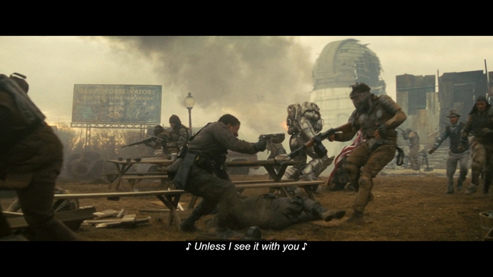 Если же кто-то думает, что чёрт с ним, с сюжетом, можно посмотреть сериал хотя бы ради развесёлого экшена – то и тут зрителя ждёт неприятный сюрприз. Экшен тут очень убогий. Что драки, что стрельба. Опытных бандитов легко раскидает в стороны новичок, которого вчера избивали сверстники, а меткость остальных варьирует по шкале от «Клинта Иствуда» до «Имперского штурмовика» в зависимости от нужды сюжета. Более или менее масштабные сцены выглядят мешаниной, в которой статисты сами прыгают на пули и предпочитают не видеть угрозы в упор. Огнестрел в руках у Гуля то не может пробить броню T-60, то пробивает одной пулей. Паладины зачем-то стреляют в потолок, когда враг перед ними, а в свалке бойцы предпочитают добивать раненых, а не стрелять в бегущих на них людей. Ни о какой тактике ни со стороны Братства Стали, ни со стороны НКР речи не идёт, хотя и та, и другая сторона позиционируют себя как профессиональных вояк. Лучшее, что они могут – бежать с флагами в самую гущу боя и стрелять во все стороны. Помните кинематографический трейлер Fallout 76? Там стрельбы была показана реалистичнее.