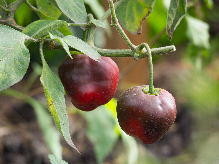 Цветы у этого перца отличаются от цветов других баккатумов фиолетовыми пятнами на кончиках лепестков с обратной стороны.