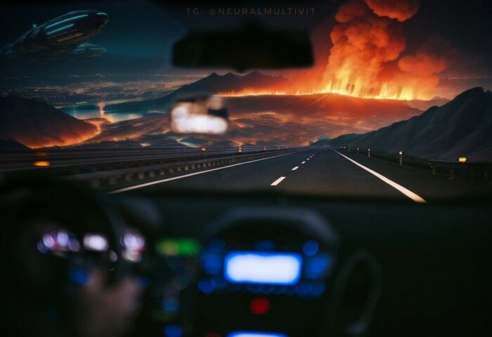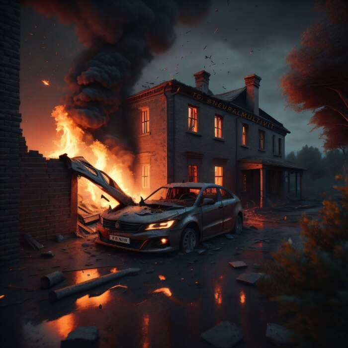 Пытаясь разглядеть всё это, гражданский смотрел в небо через лобовое стекло своего автомобиля. Он не увидел на дороге ошметки от взорвавшейся автоцистерны. Колесо распороло одним из острых кусков и машина, потеряв управление, на всей скорости влетела в угол кирпичного частного дома."