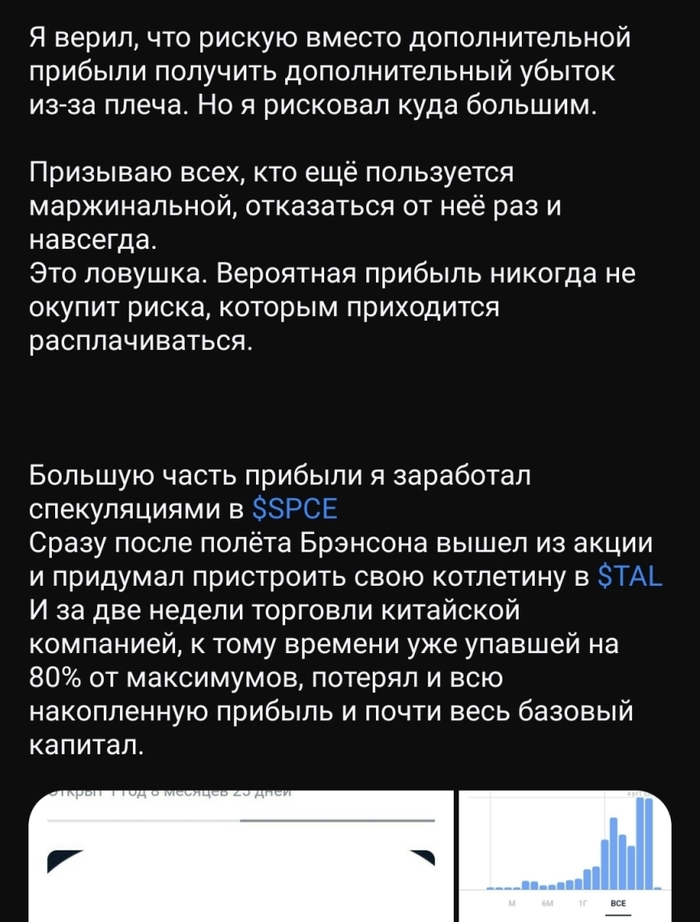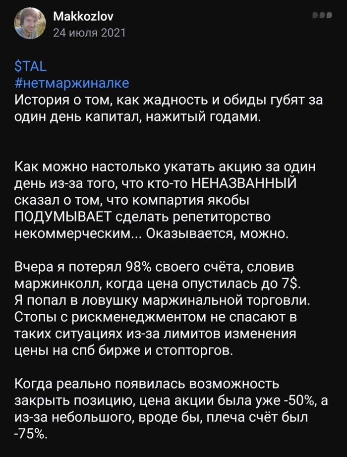 Никто из нас не застрахован от сильного движения цены актива против нас. Будь мы самыми умными инвесторами в мире, никто не знает будущего. Падение TAL стало «черным лебедем» для абсолютно всех его держателей. Но в случае героя нашей истории сработал самый губительный фактор – кредитное плечо, которое привело не просто к убыткам (как у большинства), а к полнейшему краху.