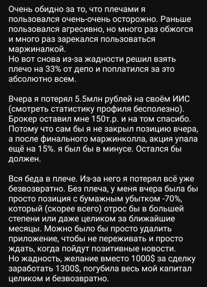 «За год я накапливаю по 400-600к. Сегодня я потерял 1.250к своих кровных денег. Я потерял 2-3 года накоплений. Фиг с ними. Обидно. Но ладно. Я мечтал через 1.5 года закрыть ИИС, купить землю, построить дом, жить с семьёй на своей земле. Теперь придется эти планы отложить на неопределенный срок».