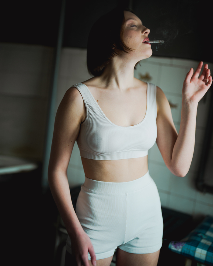 Продолжаю тему "девушка и сигарета" - это сочетание в кадре всегда трогает какие-то струны моей души. Для этого фотосета мы искали специально квартиру без ремонта и с ободранной ванной. Кадры в ванной мы сделали, конечно, но вот эти кадры на кухне с сигаретой мне понравились даже больше. В этой серии есть настроение. Обратите внимание на фон сзади модели - там есть одна особенность. Голландский угол или Dutch tilt - довольно нетрадиционный стиль композиции. Вертикальные и горизонтальные линии на фотографии не параллельны краям кадра. Я специально решил снять таким образом. Считается, что такое кадрирование немного тревожит зрителя, мозг иначе реагирует на картинку.