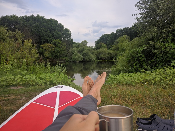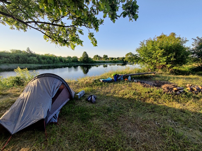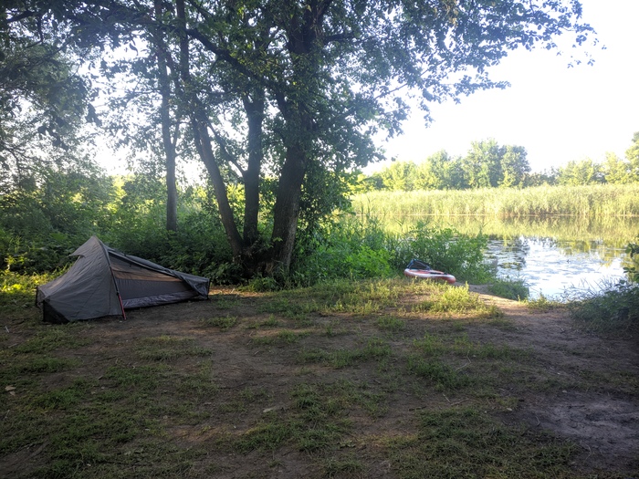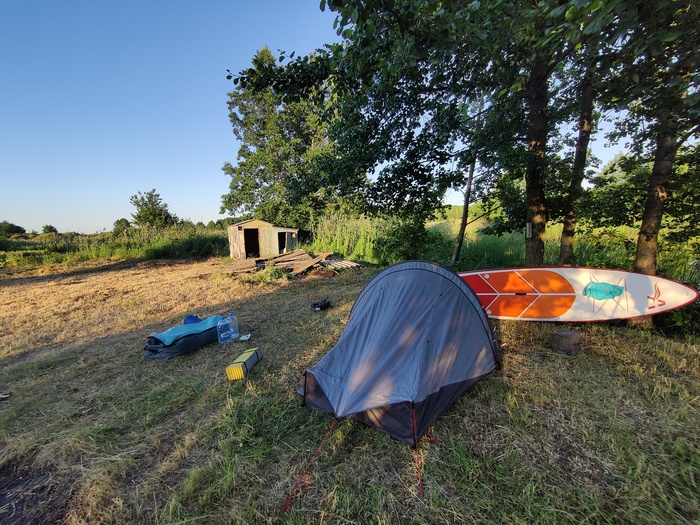 Поужинал, стало хорошо. Не мог перестать наслаждаться этим местом стоянки, оно прекрасно во всем. Справа - глубина, слева - коса и маленькая глубина. За палаткой лесок, в котором есть место для палатки и кострище, плюс можно найти дрова. Связь ловит плохо, но иногда она есть, что тоже неплохо. Сап совсем рядом, вещи далеко таскать не нужно. Ну круто же! А встал бы в Арзянке на пляже, упустил бы возможность остановиться тут. Так что, все, что не делается, все к лучшему =)