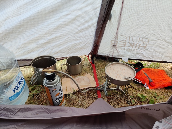 Ночью было холодно, проснулся от этого около 4-30 утра, поворочался, притянул спальник и снова уснул. Лениво было вставать, позавтракал в палатке, налил кофе и вылез из нее. Солнце постепенно нагревает все вокруг, уже лучше!