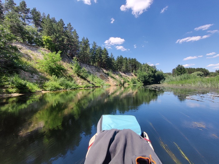 Вокруг довольно крутые берега с обвалами. Рельеф изменился, но течение при этом приятное. Время уже к обеду, солнце растапливает, иногда просто ложусь и отдыхаю.