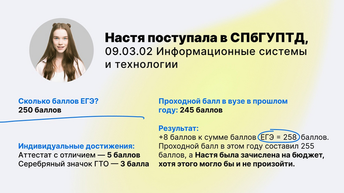Настя окончила школу с аттестатом с отличием и набрала на ЕГЭ более 70 баллов по русскому языку и математике (обязательным предметам). И вот —5 баллов уже в кармане.