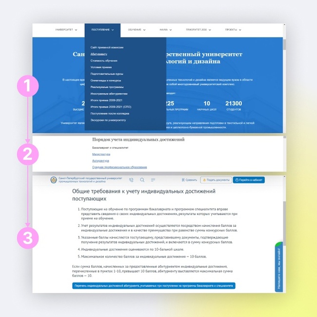 Часто задаваемый вопрос с однозначным ответом — изучить информацию на сайтах конкретных вузов. Вот небольшая инструкция на примере сайта СПбГУПТД: