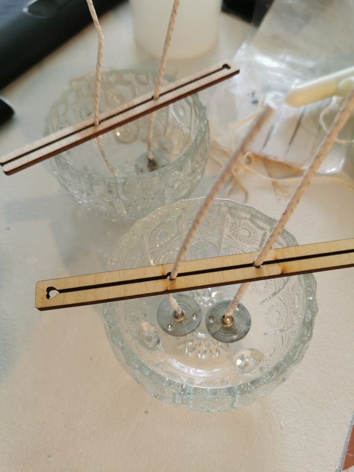 2. Готовим тару: фиксируем фитиль (удобно использовать специальные держатели или даже палочки для кофе).