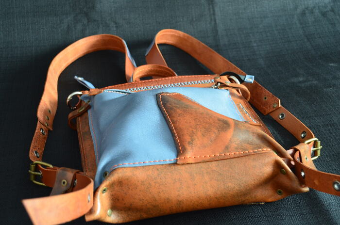 Рюкзак создан на заказ из двух различных цветов кожи. Необходимо было сделать два внешних кармана на молнии и внутренний карман с клапаном и кнопкой. Основную молнию рюкзака просили сделать с защитой от случайного проникновения.
