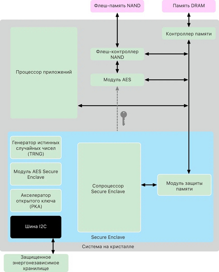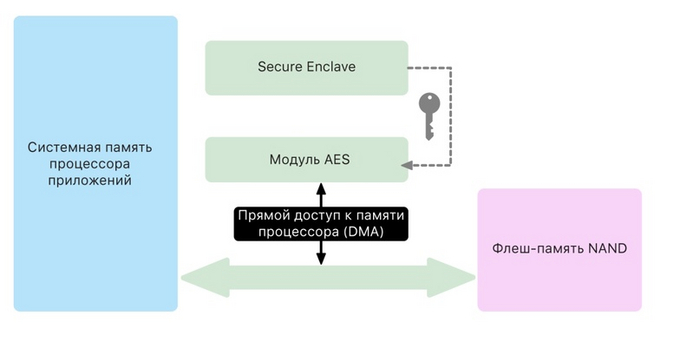Модуль AES Secure Enclave. Это аппаратный блок, который выполняет симметричное дополнительное шифрование на основе шифра AES (один блок данных шифруется в другой посредством ключа шифрования).